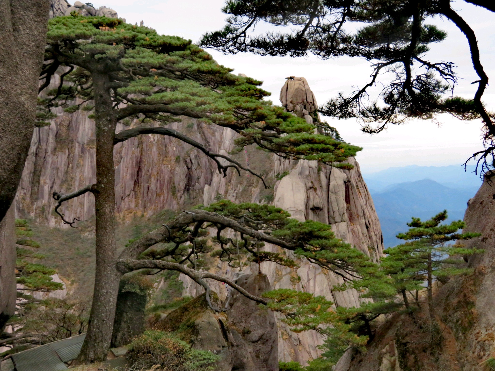 迎客松可以说是黄山的名片了,无人不知、无人不晓,一侧枝丫伸出悬崖边,就像伸出臂膀欢迎远道而来的客人,雍容大度,姿态优美。除了迎客松,还有其他各种松树:送客松、蒲团松、竖琴松、麒麟松、探海松、接引松、连理松、黑虎松、龙爪松、团结松。