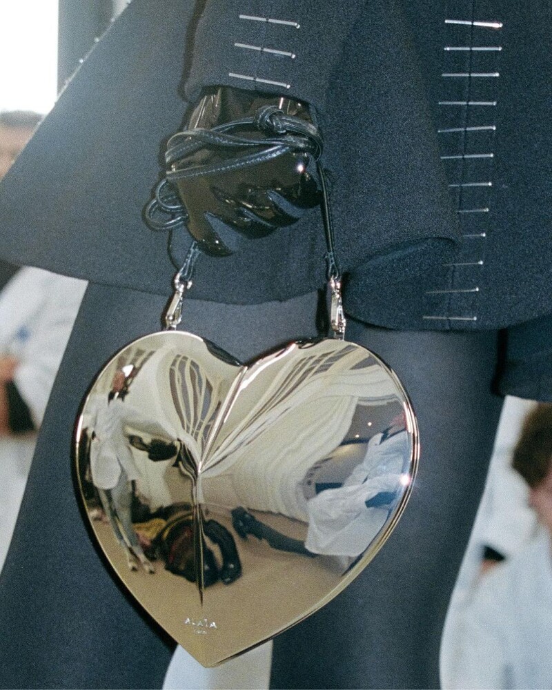 心型元素在Alaïa近年的设计中佔据很大的比例,除了被运用在高跟鞋款上,服装上也有许多桃心领的设计,不过其中所推出的LE CŒUR BAG心型手袋,更是成为2023年的热门单品,最新的镜面金属质感材质,很有未来感氛围。
