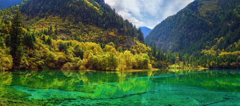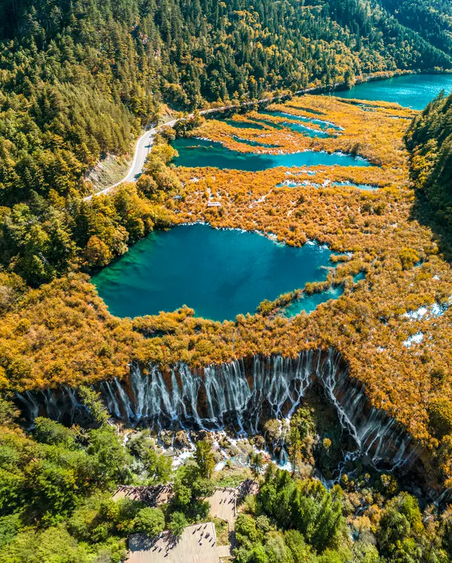 特点:有碧绿的湖水、飞泻的瀑布、雪峰林立的高山和五彩斑斓的森林。湖水清澈见底,颜色随季节和光线变化而不同,如五彩池、五花海等。